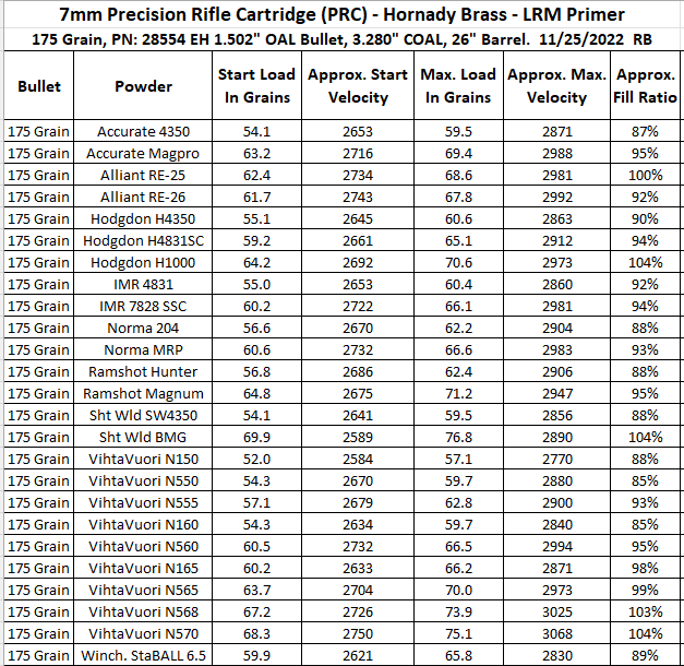 Berger Bullets provided me with their load data for the 7mm 175gr Elite Hunter in 7mm PRC and I worked up a load with H1000. I ended up at around 68.5gr to 68.8gr of H1000 which put me above 3000fps in the 26″ barrel.
