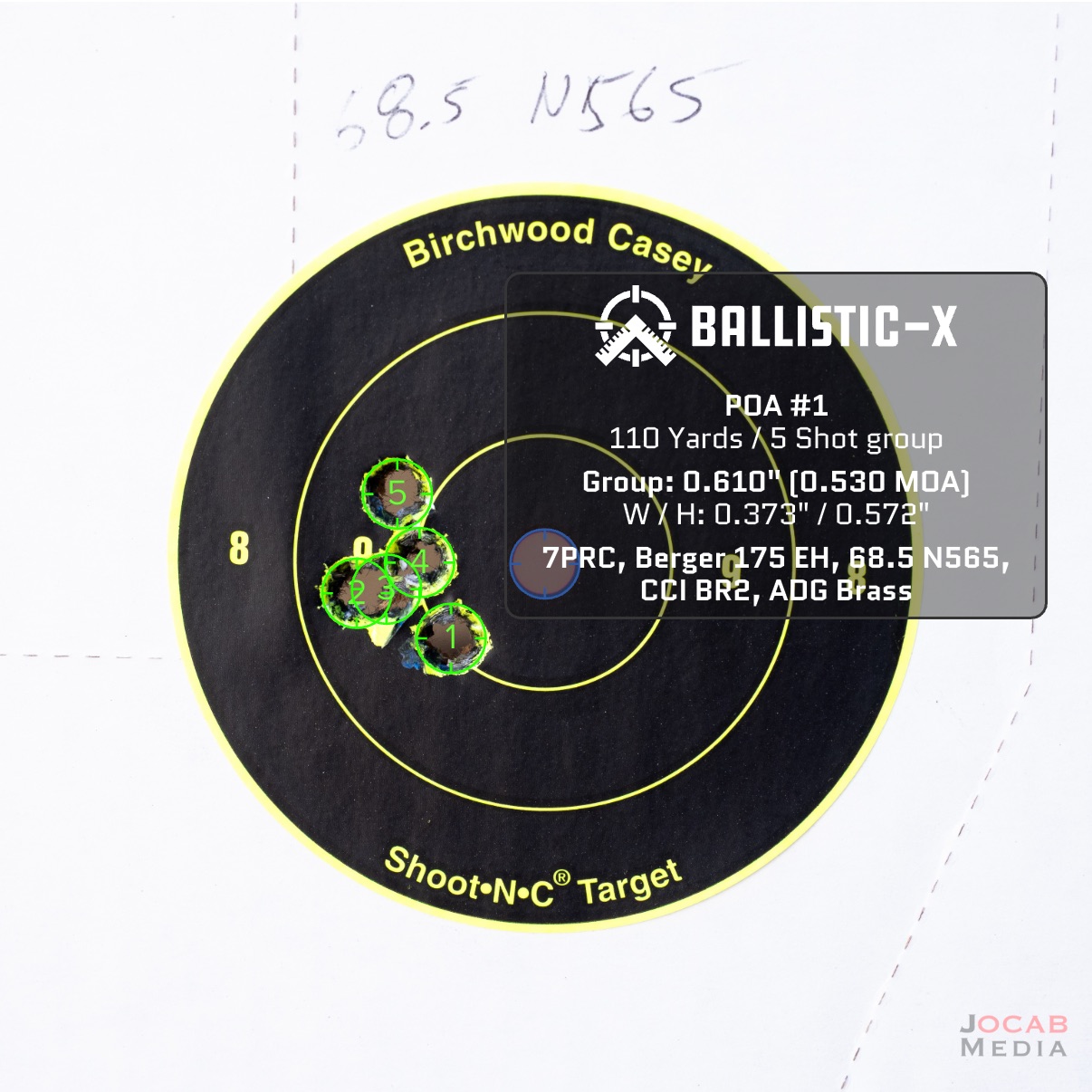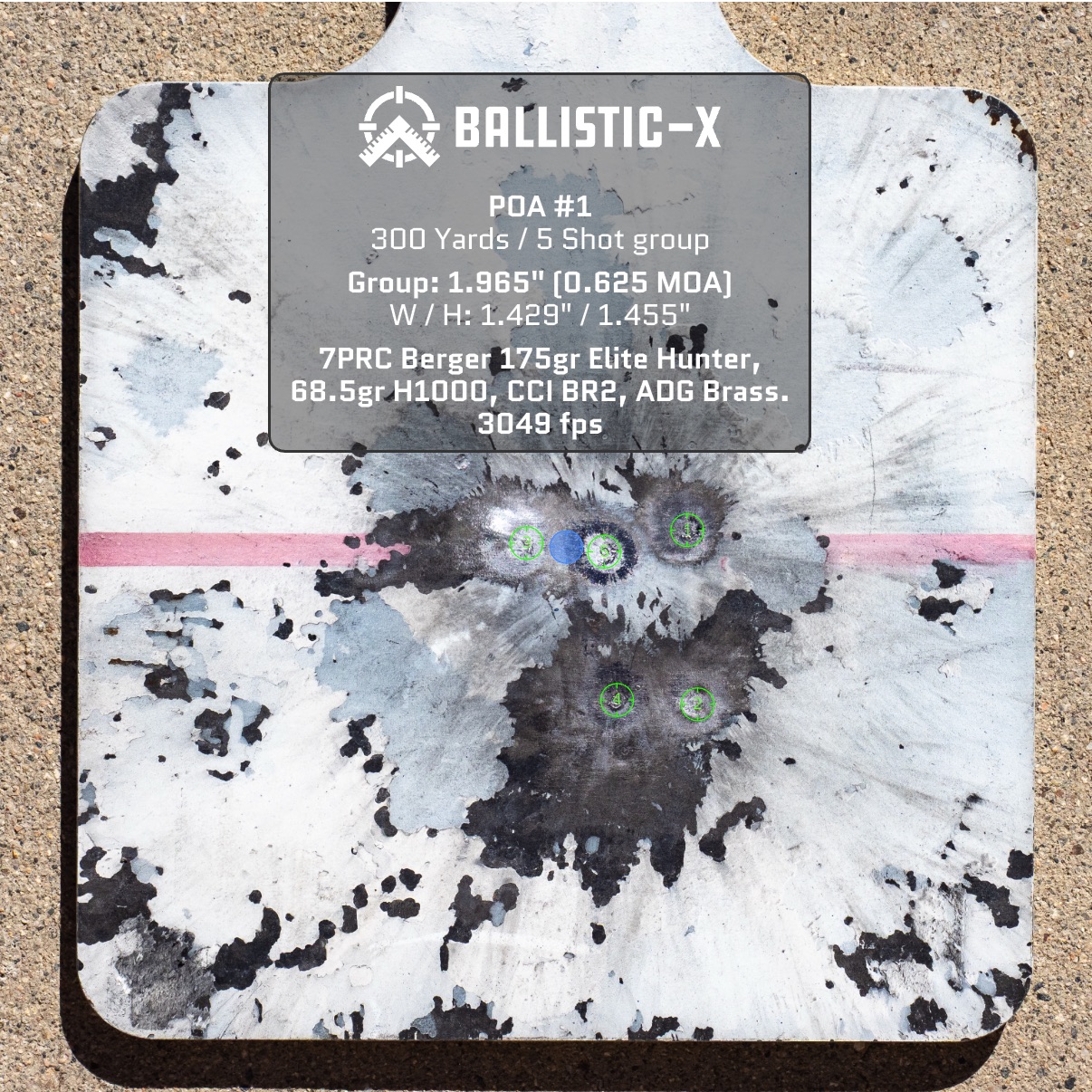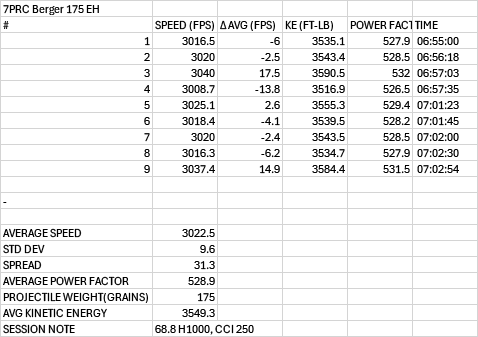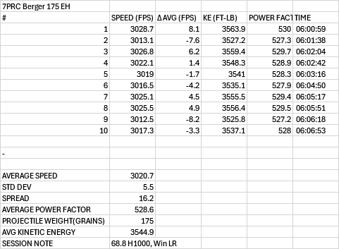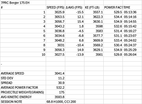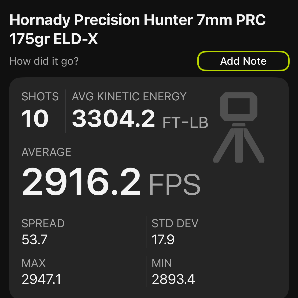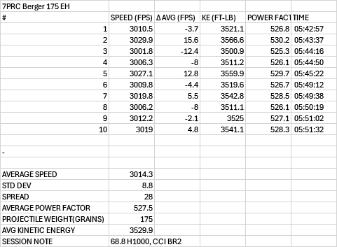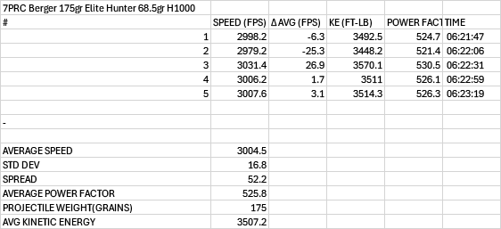 Hornady Precision Hunter 7PRC 175gr ELD-X out of the brand new barrel reflected the lower velocities that the industry was reporting last year in 2024.
