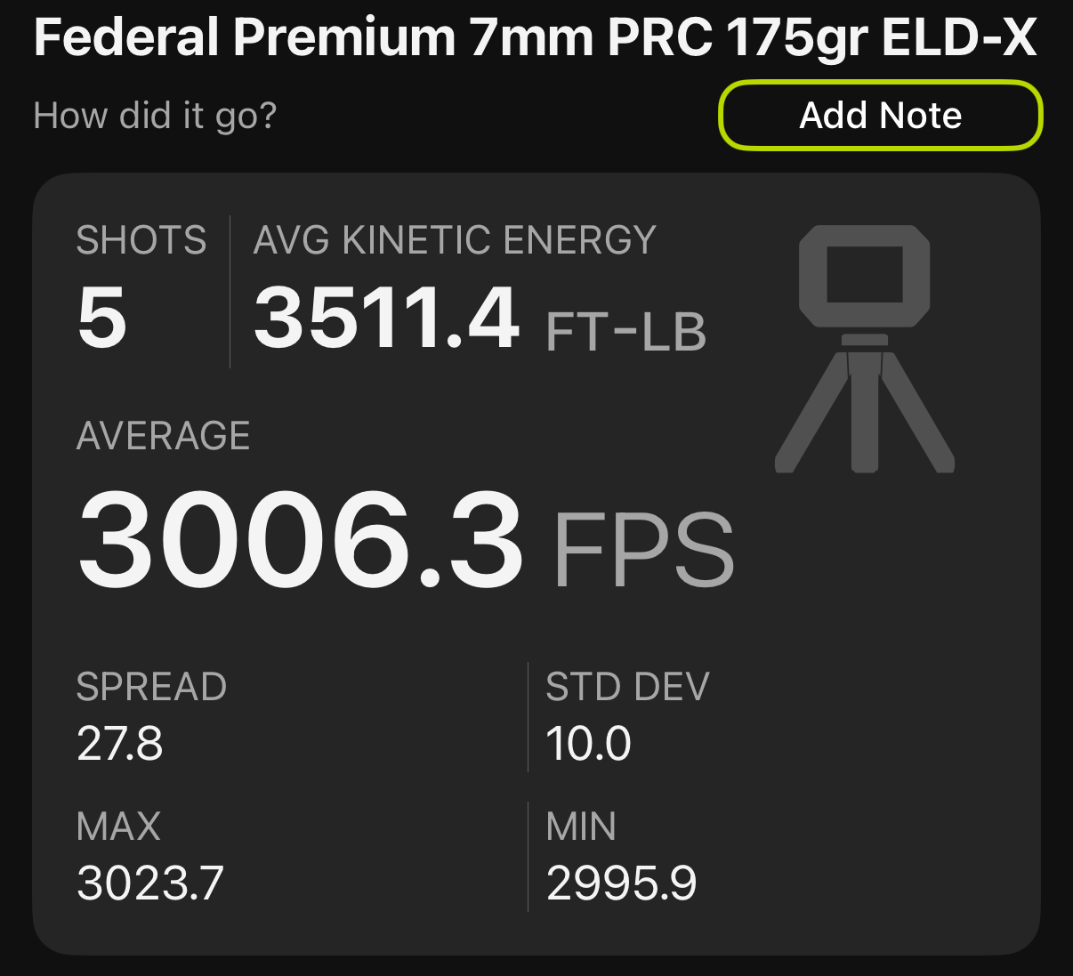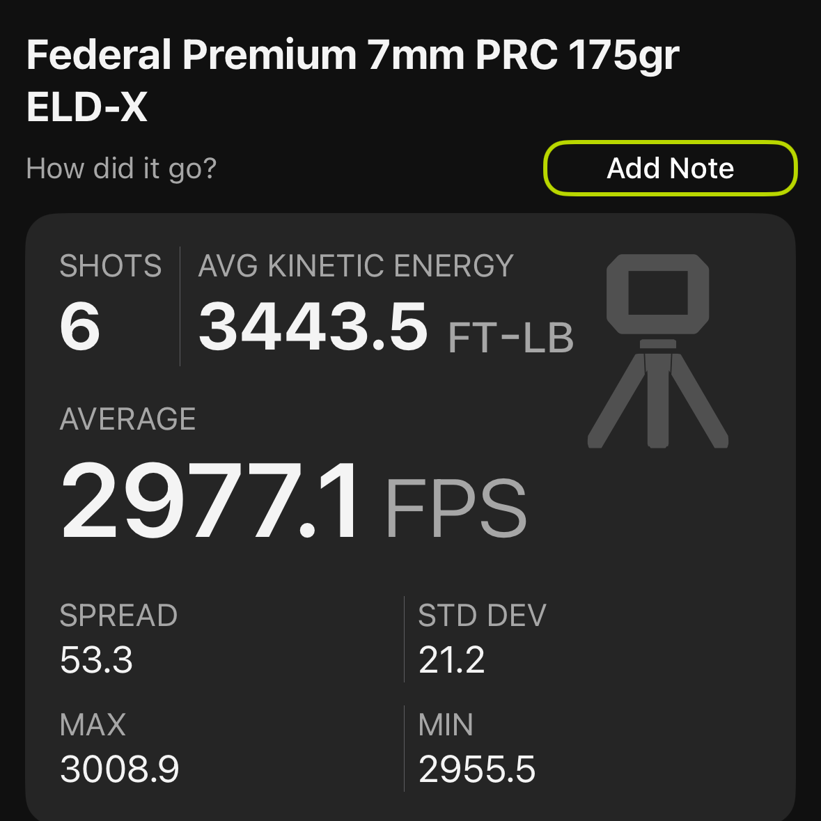 Federal Premium 7mm PRC with the same 175gr ELD-X bullet came closer to the 3000 fps specification that Federal also indicates for their ammunition at 2977 fps, but still short of 3000 fps.