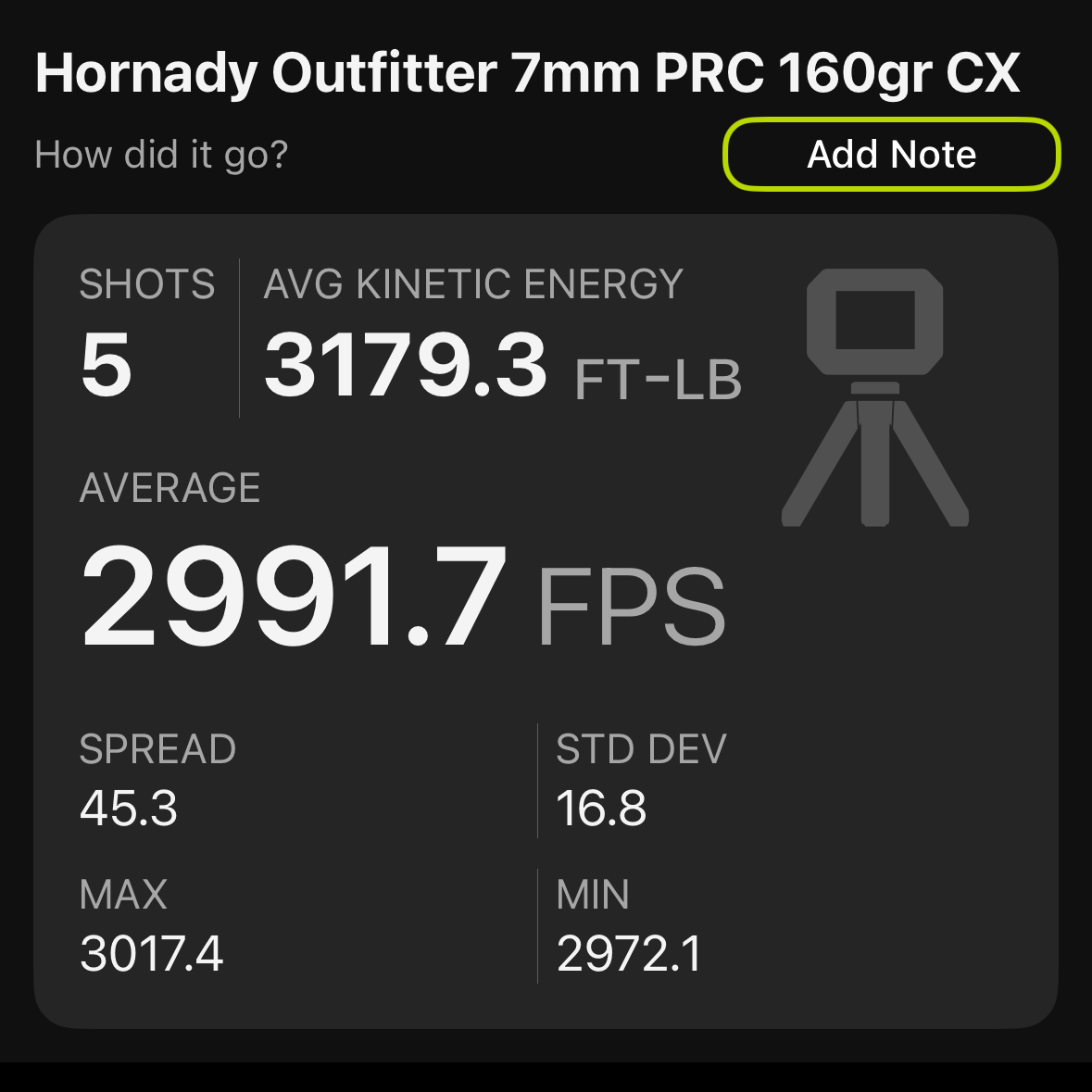 Hornady Outfitter 7mm PRC 160gr CX is rated by Hornady with a muzzle velocity of 3000 fps out of a 24″ and in reality through the 26″ Proof barrel came in at ~2992 fps.