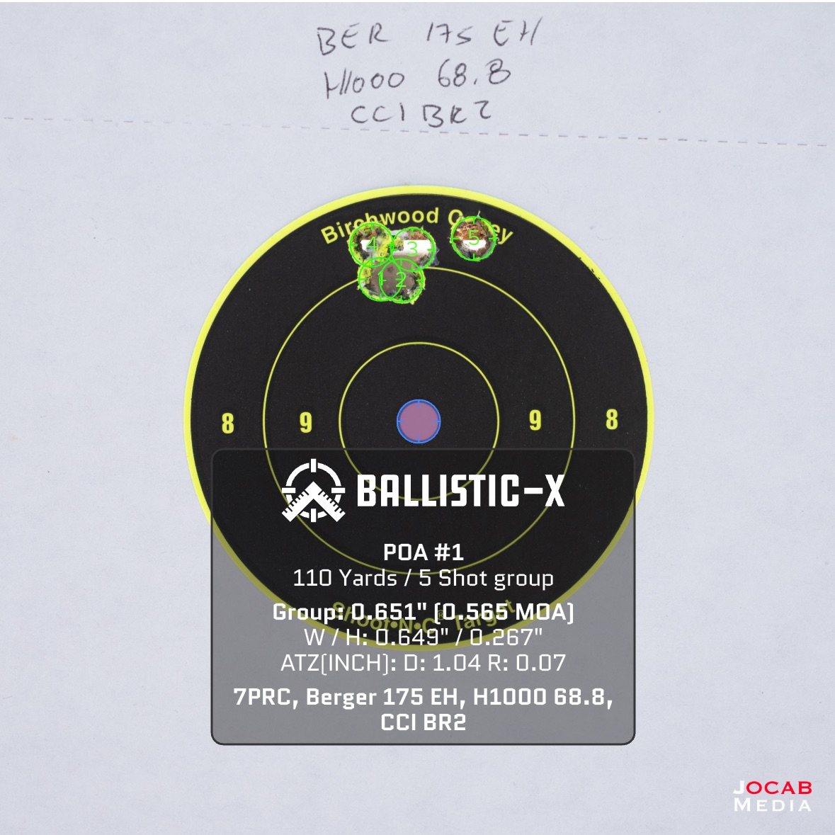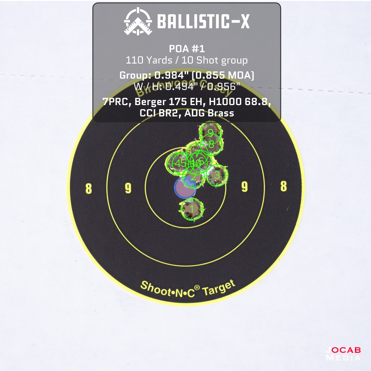 Hornady states that Hornady Precision Hunter 7mm PRC 175gr ELD-X will have a muzzle velocity of 3000 fps out of a 24″ barrel. Obviously, this is not the case in this 26″ Proof Research barrel at only 2916 fps.