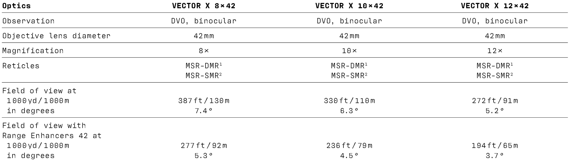 In the case of the Vector X 10×42 MSR-DMR that I own, the 330 ft @ 1000 yd field of view at 10x is reduced to 236 ft @ 1000 yd at 14x. The Range Enhancers also add an additional ~2.8 oz (78 grams) in weight and ~2.76 in (70 mm) in length to the Vector X.